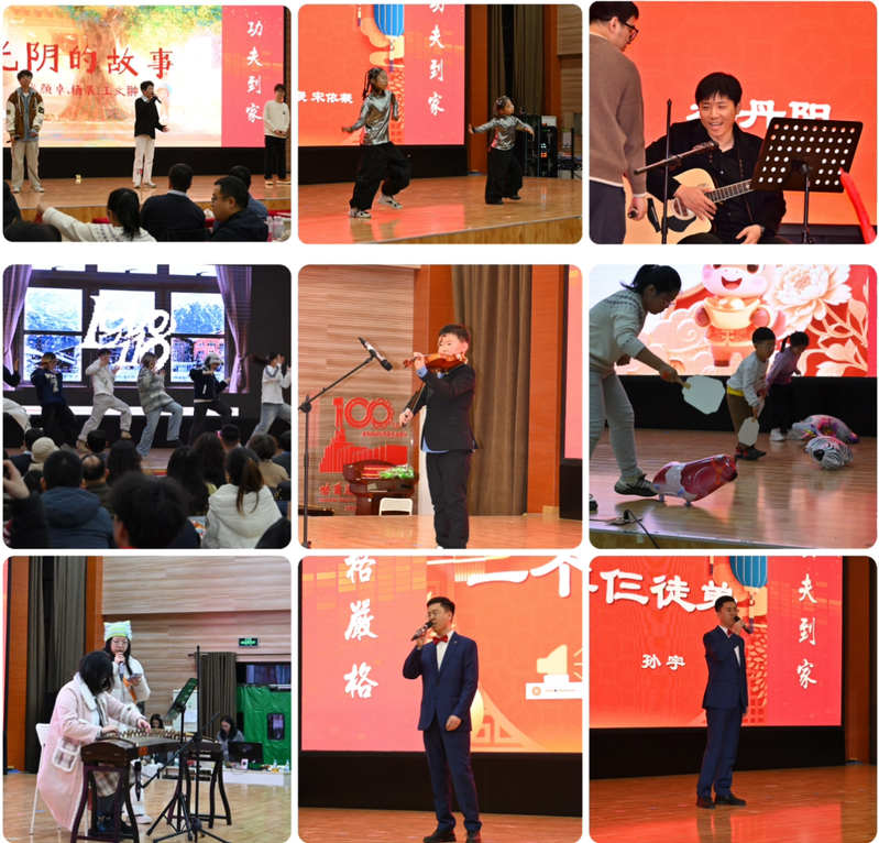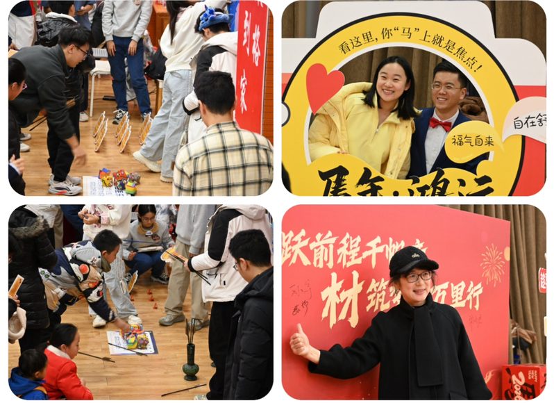 灵蛇衔瑞去,骏马踏春来。联欢会以新春游园会为主线,组织了投壶、掷沙包、套圈、猜谜等充满节日氛围的游戏,老师们在摊位前纷纷驻足,与同学们和家属共同游玩、合影,老师们互赠新年祝福,现场气氛欢乐而温馨。联欢会上,老师和学生代表为大家共同奉上了精彩纷呈的歌曲、舞蹈等节目,小朋友们更是为晚会增添了天真烂漫的氛围。舞台上大家载歌载舞,台下掌声阵阵,欢声笑语,丰富多彩的游戏环节更是将整场晚会的气氛推向高潮。